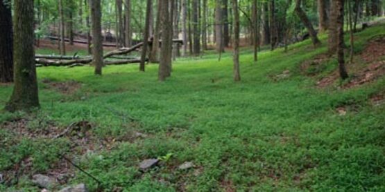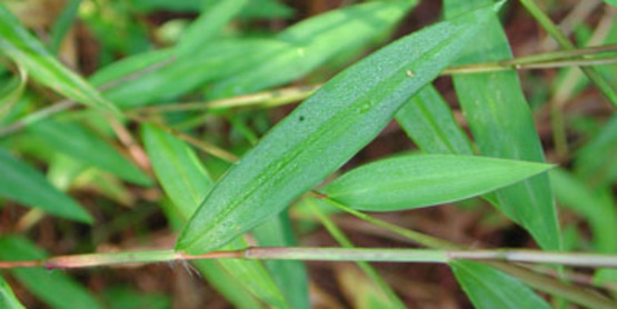 Japanese Stiltgrass (Microstegium vimineum ) was probably introduced to the U.S. as packing material in crates from China. It can grow in a variety of habitats where it forms dense stands and crowds out native species ( from USDA Plant Profiles)